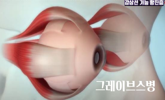 갑상선 기능항진증, 튀어나온 눈(안구돌출), 더위가 느껴지고, 피로, 긴장, 불안이 심해지고 체중감소, 휴식시도 가슴이 빠르게 뛰며 맥박이 90회 이상, 최근 손떨림 등의 증상이 있게 됩니다. 자가 면역항체가 지속적으로 갑상선을 자극해서 갑상선 호르몬이 과다하게 분비되는 그레이브스병, 면역 체계에 오류가 생겨 환자 자신의 면역세포가 갑상선을 자극하는 항체를 만들어 갑상선호르몬을 과다 분비하게 만드는 질환 입니다.